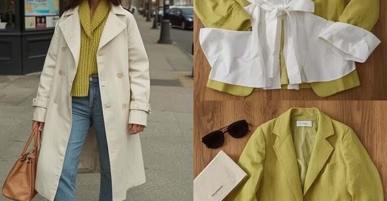 - look 2 — kawiarnia i zakupy: kremowy t-shirt z organicznej bawełny, kurtka parkowa w kwaśnym miętowym, jeansy slim; proporcje: 70% krem, 20% miętowy, 10% denim,